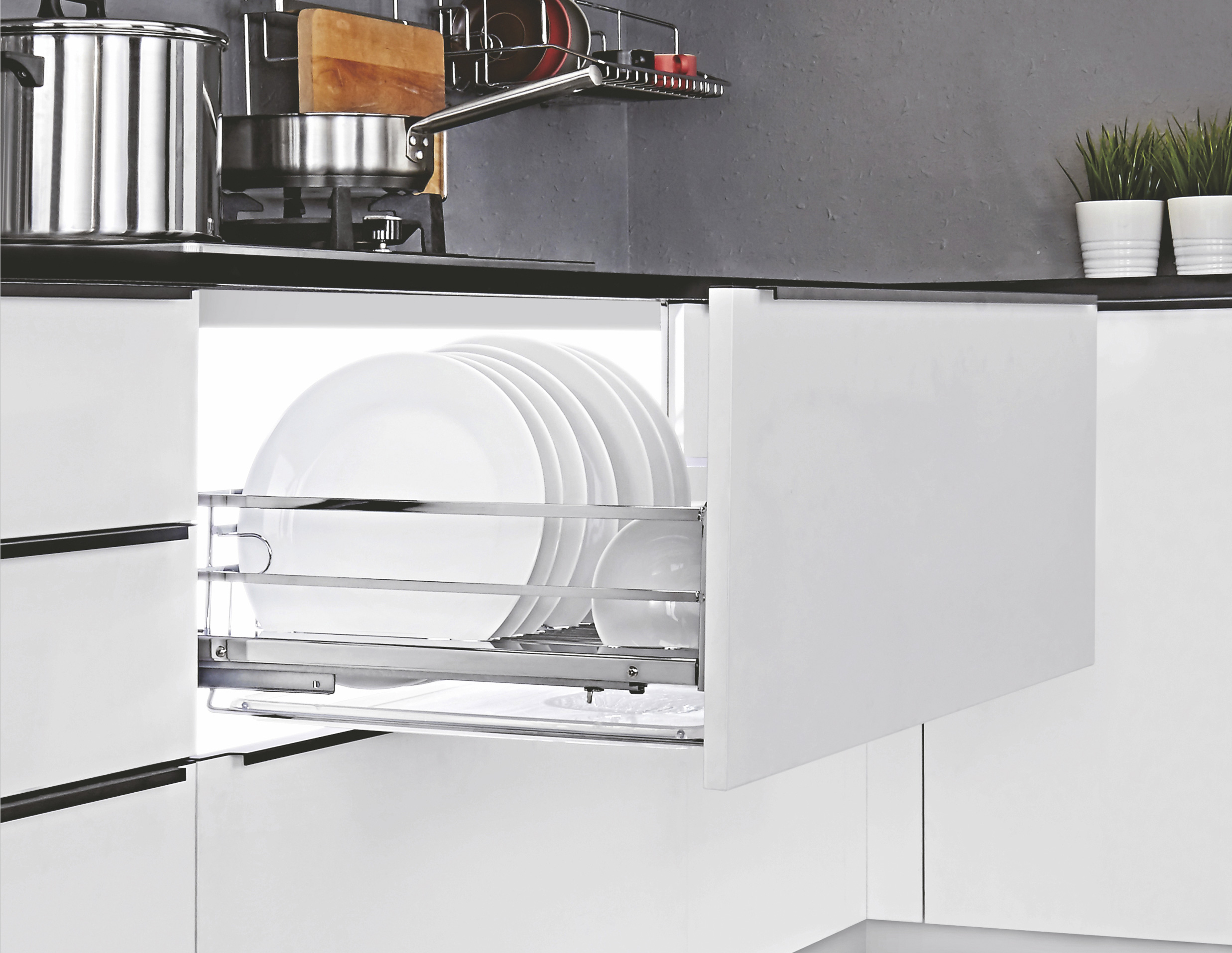 Выдвижная корзина-сушка CARMA KRS05 в порошковом покрытии графитового оттенка с плоским прутком предназначена для хранения разноплановой посуды в нижней базе мебельного гарнитура. Продуманная схема расположения внутренних отсеков корзины позволяет одинаково качественно просушить как крупные и глубокие тарелки, крышки, кастрюли, так и небольшие блюдца и чашки. Модель оснащена удобным поддоном из современного экологичного пластика для сбора стекающих с посуды капель. Поддон легко снимается для чистки и мойки. CARMA устанавливается на направляющие с синхронизацией и доведением длиной 450 мм. Модель предложена в трёх вариантах ширины – 600, 800 и 900 мм. Качественное современное порошковое покрытие обладает повышенными прочностными и антикоррозийными свойствами.