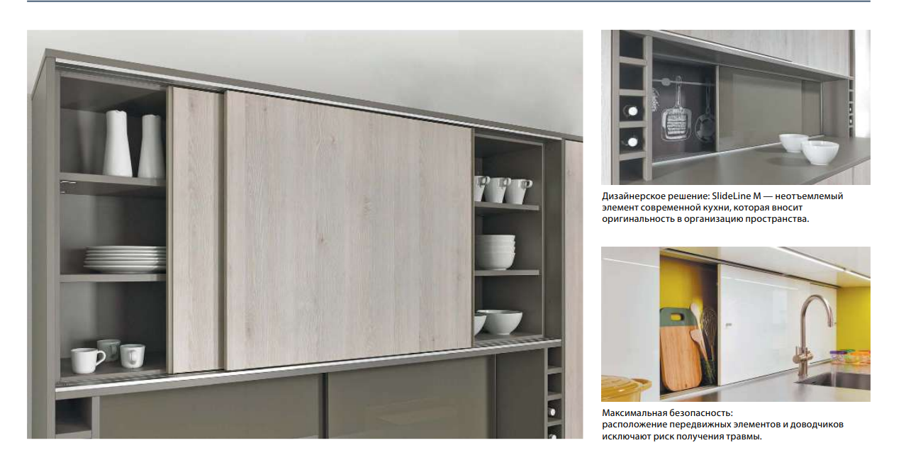 С системой SlideLine M конструирование мебели становится очень легким и доступным. Система впечатляет своей универсальностью, она с легкостью вписывается в любые дизайнерские решения, для вашего творчества нет никаких ограничений. Двухдорожечная система SlideLine M может устанавливаться в 2- или 3-дверные шкафы с весом одной двери до 30 кг. Опциональный демпфер Silent System встроен в ходовой элемент и амортизирует двери при открывании, закрывании и защищает их от соударения.