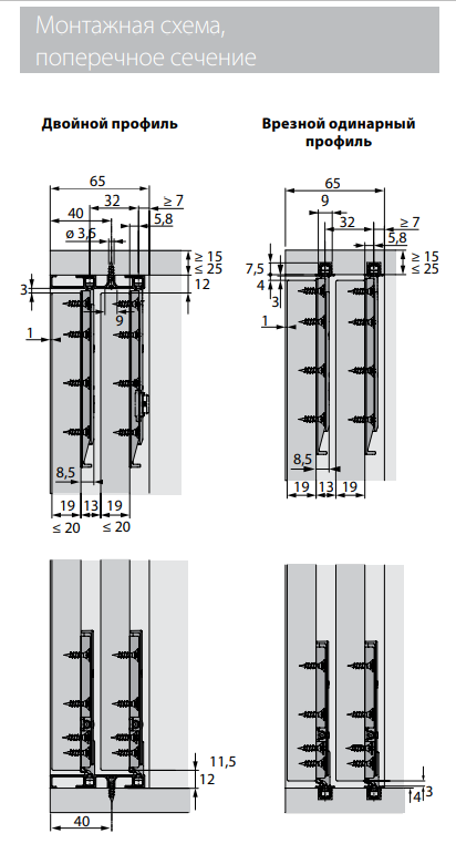 Два типа направляющих профиля: врезной одинарный профиль и двойной профиль под приклеивание или прикручивание.