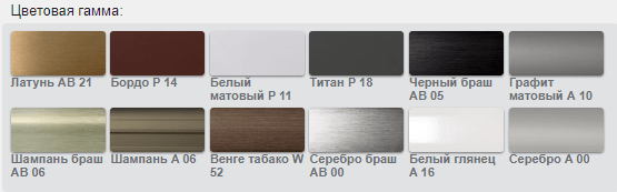 | Цвета: Белый матовый P 11, Черный браш АВ 05, Графит матовый А 10, Шампань браш AB 06, Серебро браш AB 00. 1МП | 179 |