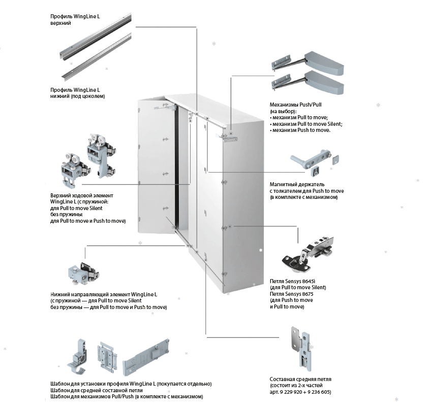 WingLine L — надежная система для складных дверей с верхним и нижним ходовым элементом, а так же дополнительным монтажом на боковине при помощи петель Sensys. Революционный механизм Push to move/Pull to move Silent для перемещения створок одним движением руки обеспечивает доступ ко всему внутри шкафа. Эффект панорамы позволяет получить полный доступ к содержимому шкафа. WingLine L можно применять как в офисе, так и в спальне для шкафов.